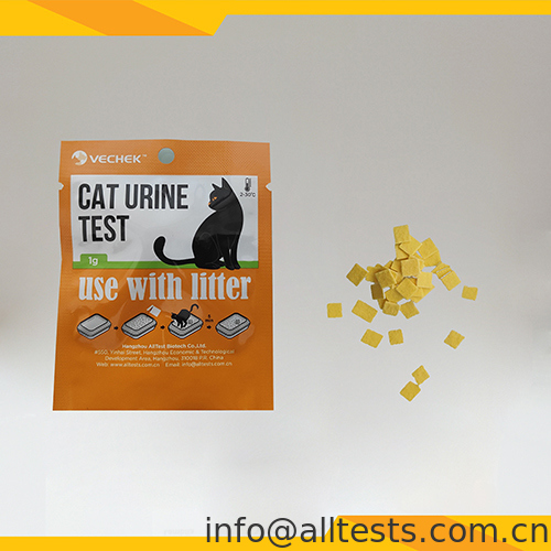 3Nadat de kat heeft geurineerd, wacht u 5 minuten en observeer de kleurverandering van het natte gebied van de urine op het kattenlak.