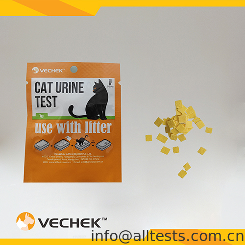 3. Wacht 5 minuten nadat de kat heeft geürineerd en observeer de kleurverandering van het natte urinegebied op de kattenbakvulling.